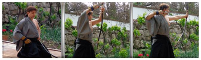 A continuación se realiza un saludo de rodillas y de nuevo de pié se avanzan tres pasos hasta la línea de tiro. Después se vuelven a arrodillar y giran 90º quedando en línea con la diana. En este momento se carga el arco con la primera de las flechas y se inicia la secuencia de tiro, desde el primero hasta el último de los tiradores, manteniendo los tiempos adecuados entre un tirador y otro. Tras lanzar las dos flechas los tiradores se van retirando hacia la salida, se hace un nuevo saludo al tokonoma y finalmente, se sale del área de tiro.